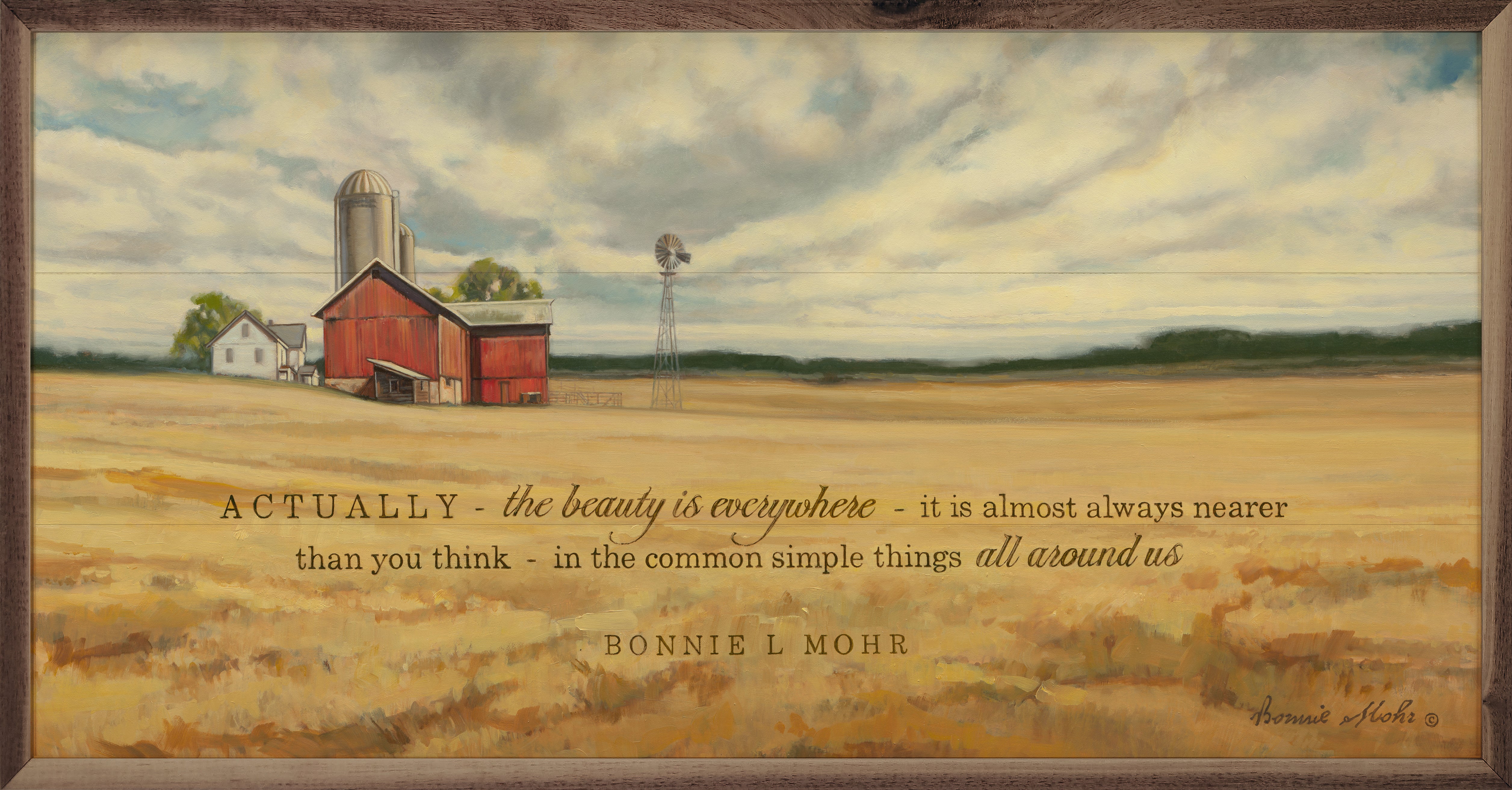 Artwork by artist Bonnie Mohr makes this personalized beautiful unique piece a simple way to bring beauty and charm to any wall or shelf within the home. It is made from high quality American hardwood planks with a hand painted face, and printed with UV cured ink, and is framed in a natural walnut frame. Each piece is unique with its own personality, marks, wood grain, and look. Easy to clean with a dry cloth.