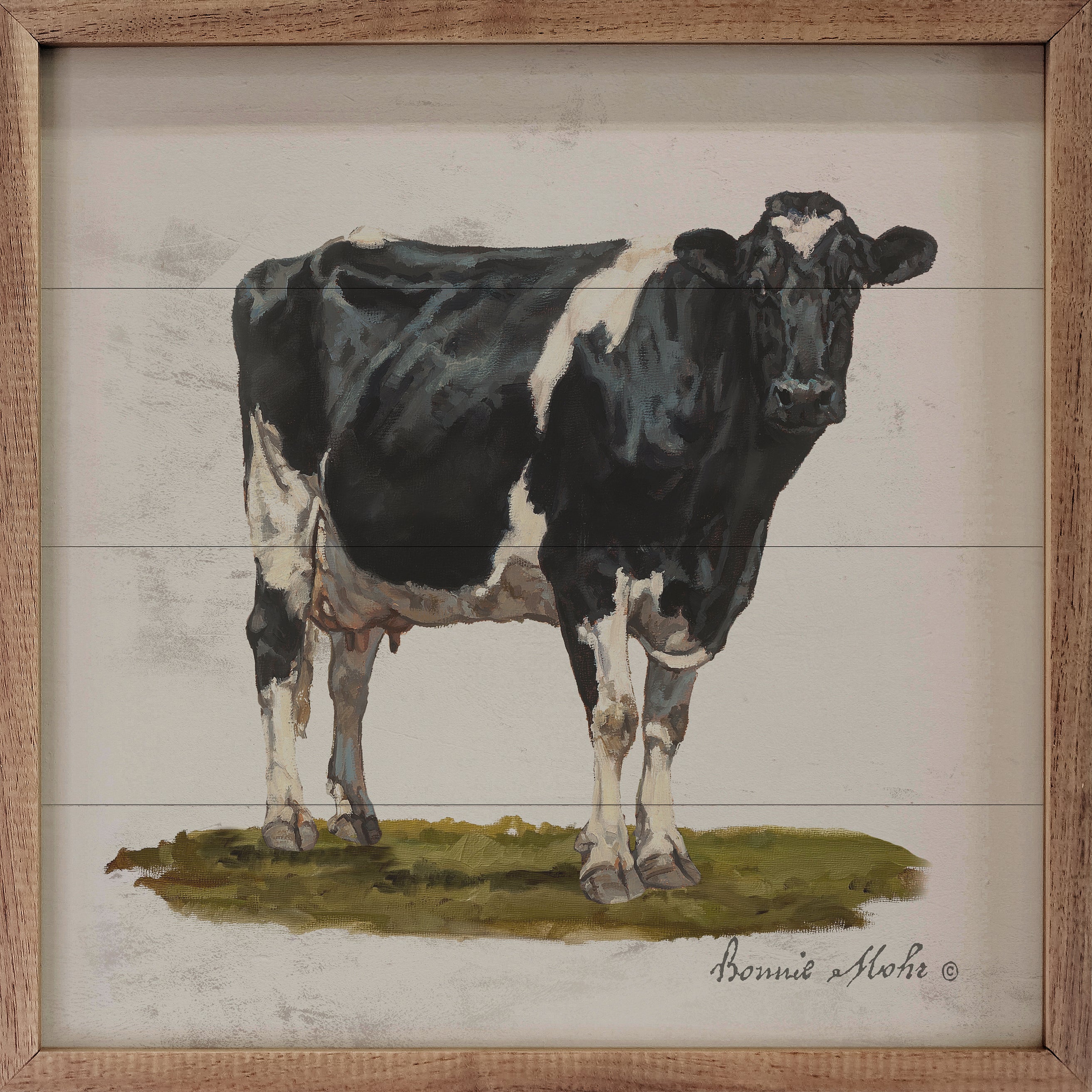Artwork by artist Bonnie Mohr makes this beautiful unique piece a simple way to bring beauty and charm to any wall or shelf within the home. It is made from high quality American hardwood planks with a hand painted face, and printed with UV cured ink, and is framed in a natural walnut frame. Each piece is unique with its own personality, marks, wood grain, and look. Easy to clean with a dry cloth.