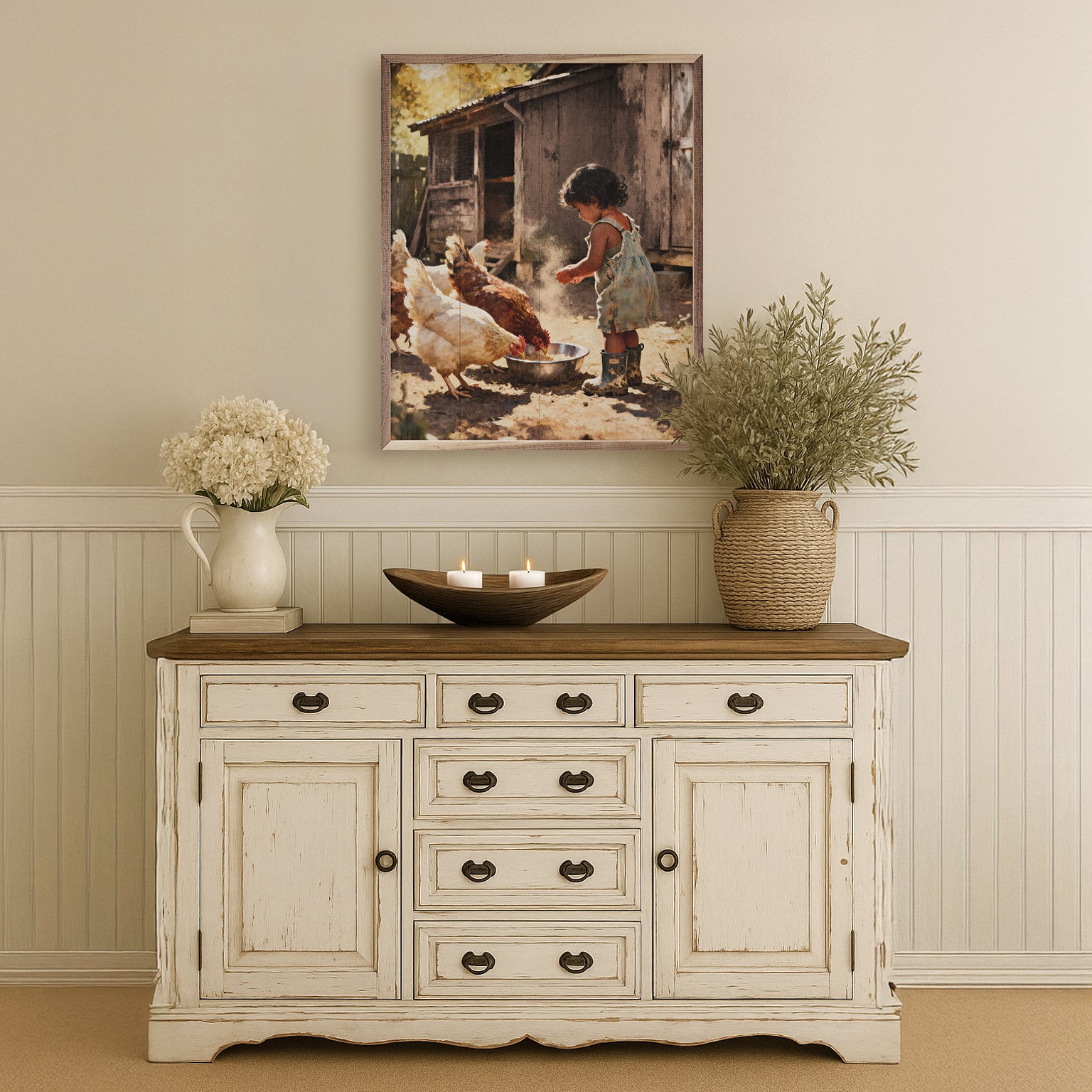 Featuring a solid wood insert with intricate, rustic farm-inspired designs, this piece is framed in rich walnut to showcase the natural wood grain. Its charming craftsmanship and down-to-earth appeal make it a perfect addition to any farmhouse décor, offering timeless style and quality.