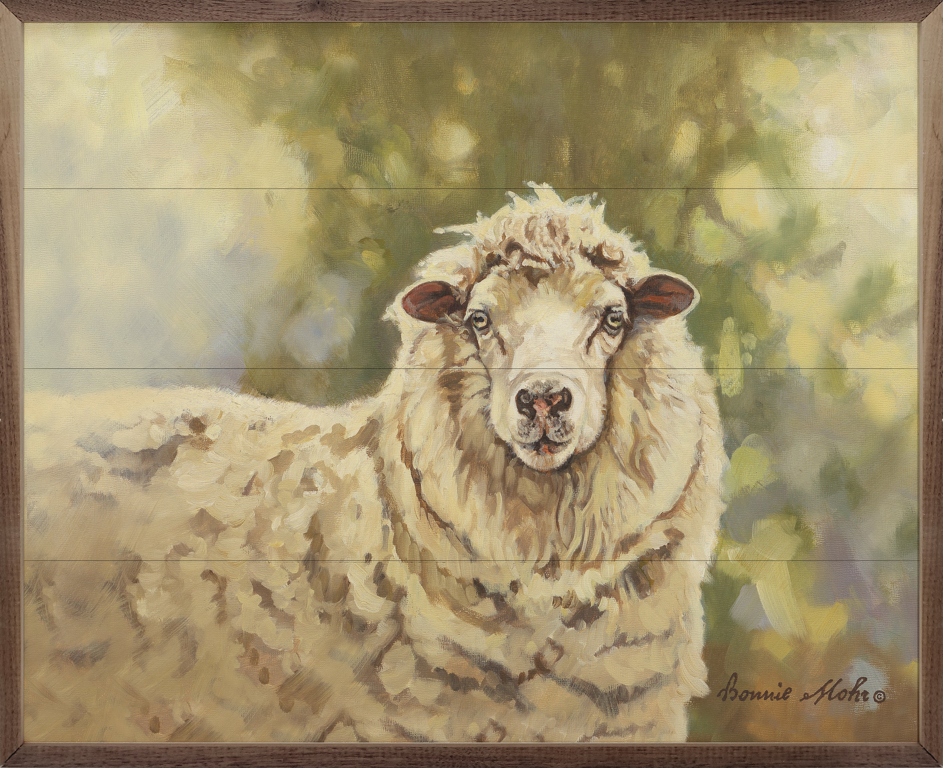 Artwork by artist Bonnie Mohr makes this beautiful unique piece a simple way to bring beauty and charm to any wall or shelf within the home. It is made from high quality American hardwood planks with a hand painted face, and printed with UV cured ink, and is framed in a natural walnut frame. Each piece is unique with its own personality, marks, wood grain, and look. Easy to clean with a dry cloth.