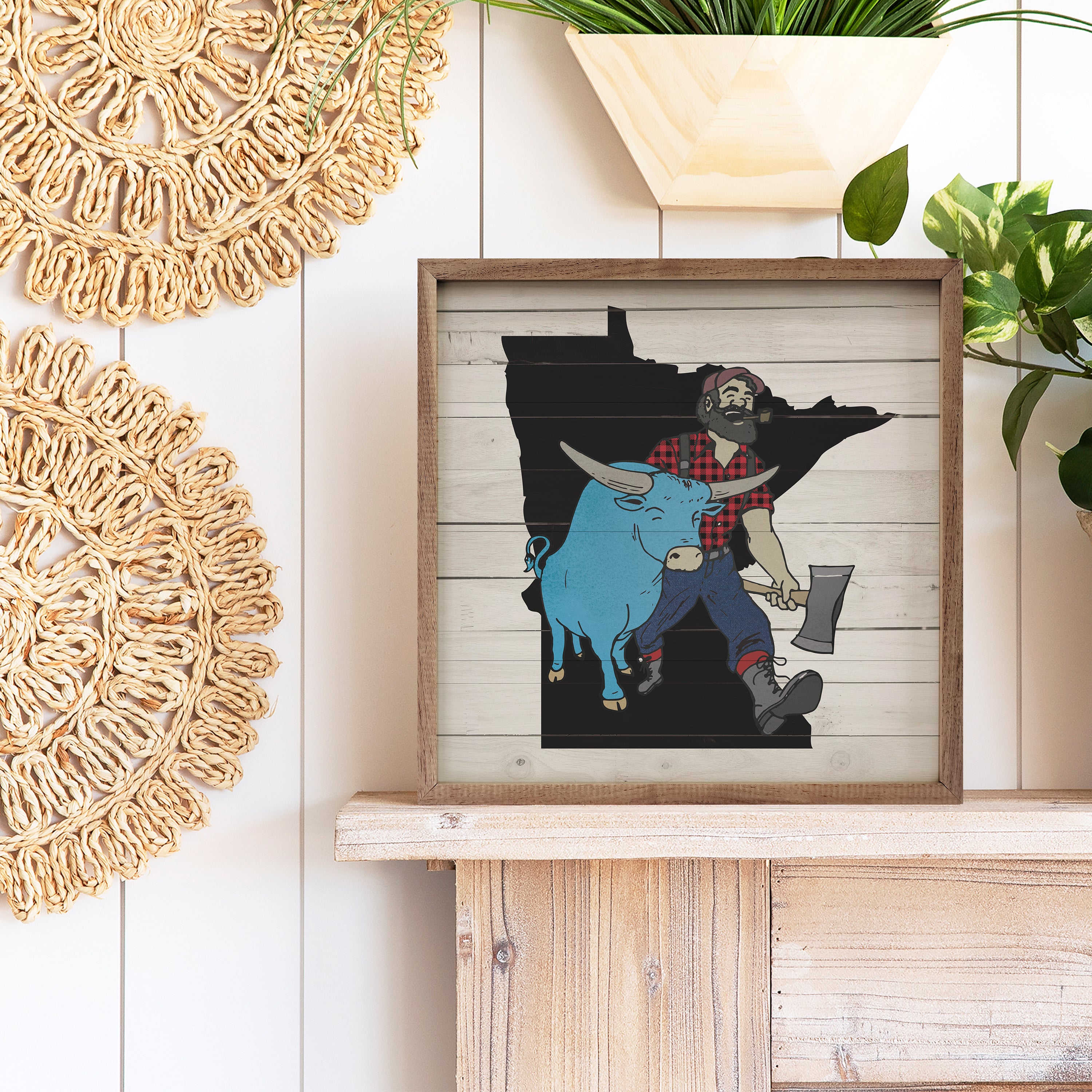 This unique piece is a simple way to bring beauty and charm to any wall or shelf within the home. It is made from high quality American hardwood planks with a hand painted face, and printed with UV cured ink, and is framed in a natural walnut frame. Each piece is unique with its own personality, marks, wood grain, and look. Easy to clean with a dry cloth.