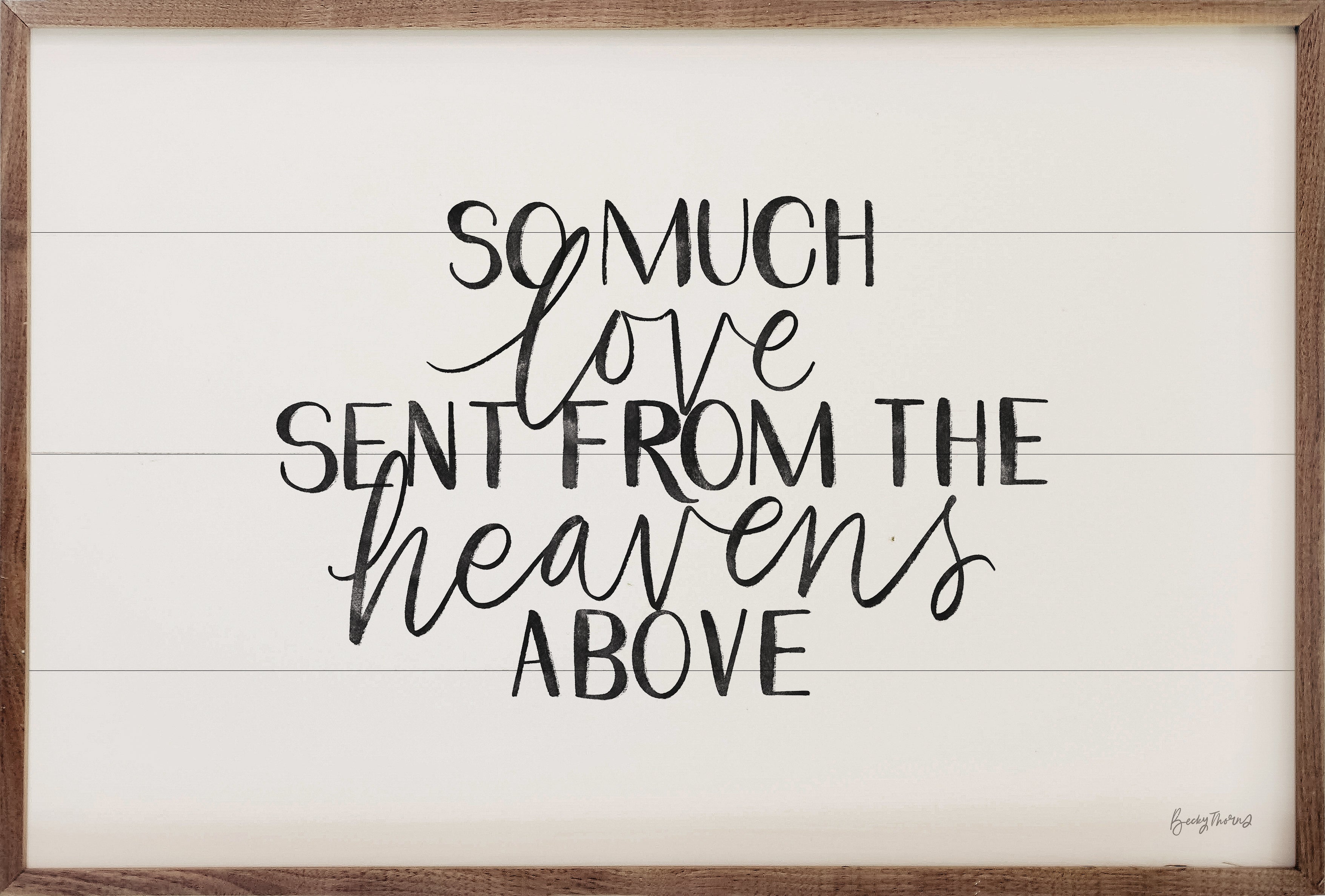 Artwork by artist Becky Thorns makes this beautiful unique piece a simple way to bring beauty and charm to any wall or shelf within the home. It is made from high quality American hardwood planks with a hand painted face, and printed with UV cured ink, and is framed in a natural walnut frame. Each piece is unique with its own personality, marks, wood grain, and look. Easy to clean with a dry cloth.