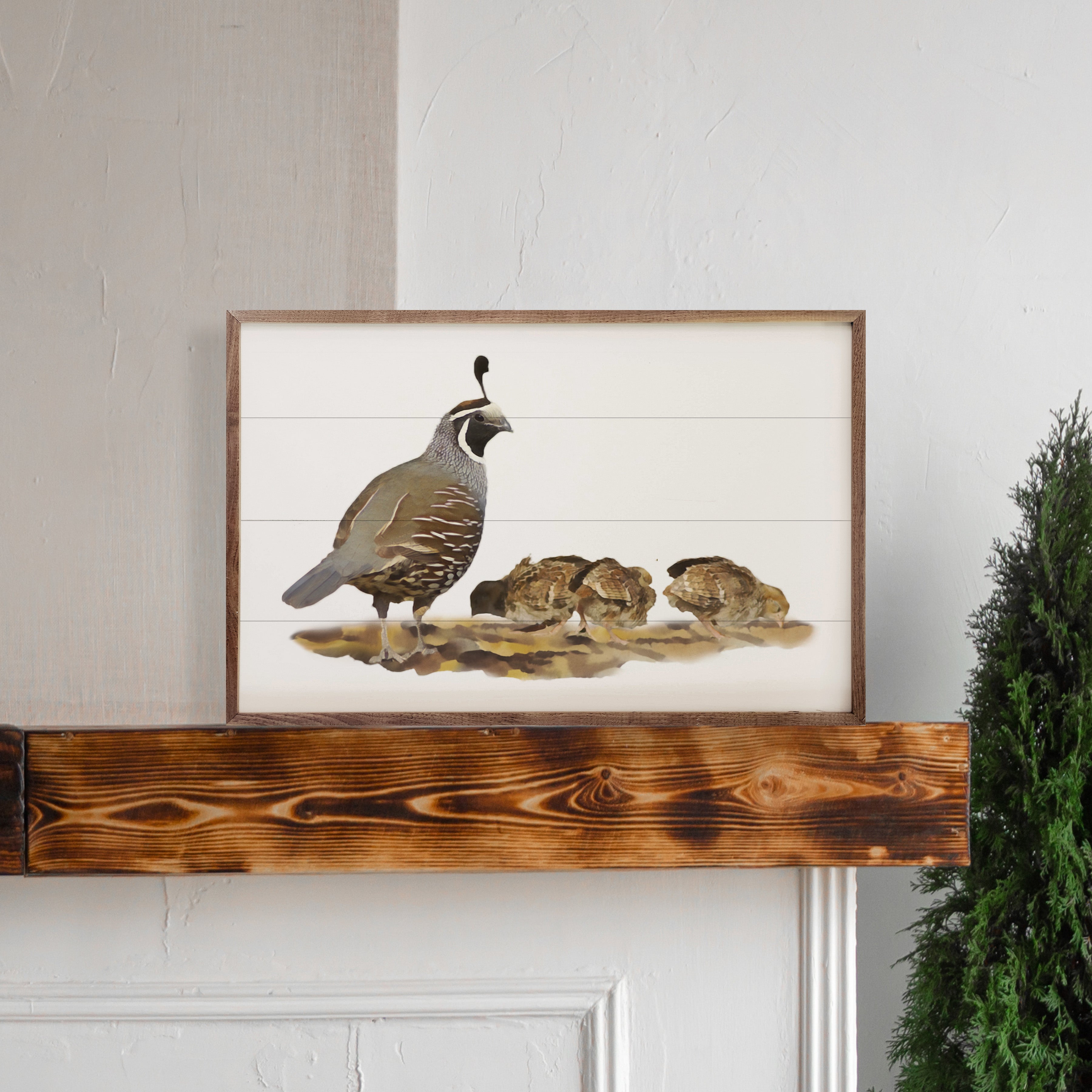 This unique piece is a simple way to bring beauty and charm to any wall or shelf within the home. It is made from high quality American hardwood planks with a hand painted face, and printed with UV cured ink, and is framed in a natural walnut frame. Each piece is unique with its own personality, marks, wood grain, and look. Easy to clean with a dry cloth.