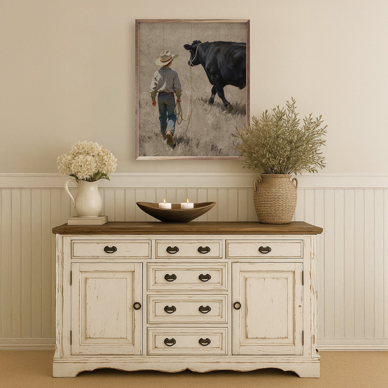 Featuring a solid wood insert with intricate, rustic farm-inspired designs, this piece is framed in rich walnut to showcase the natural wood grain. Its charming craftsmanship and down-to-earth appeal make it a perfect addition to any farmhouse décor, offering timeless style and quality.