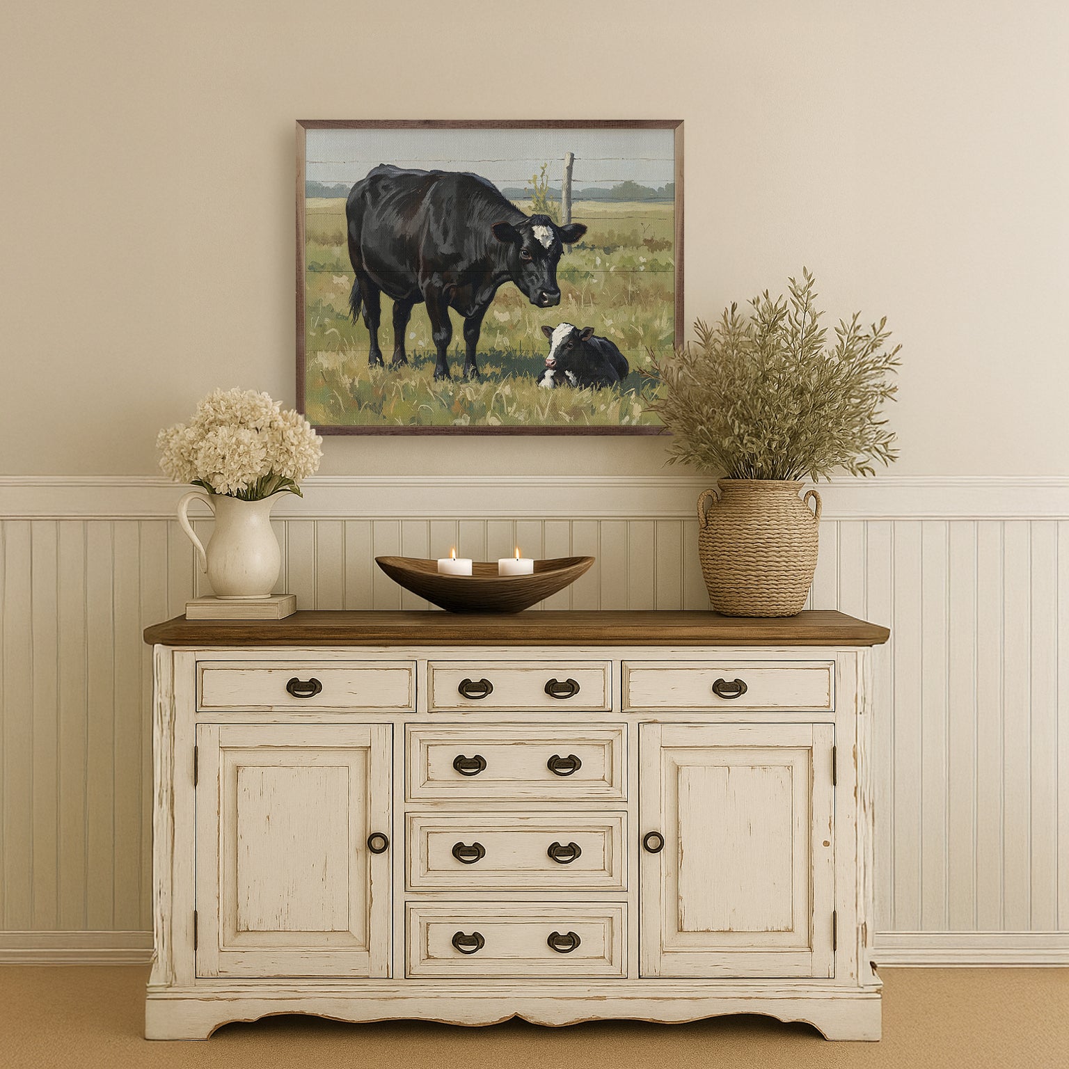 Featuring a solid wood insert with intricate, rustic farm-inspired designs, this piece is framed in rich walnut to showcase the natural wood grain. Its charming craftsmanship and down-to-earth appeal make it a perfect addition to any farmhouse décor, offering timeless style and quality.