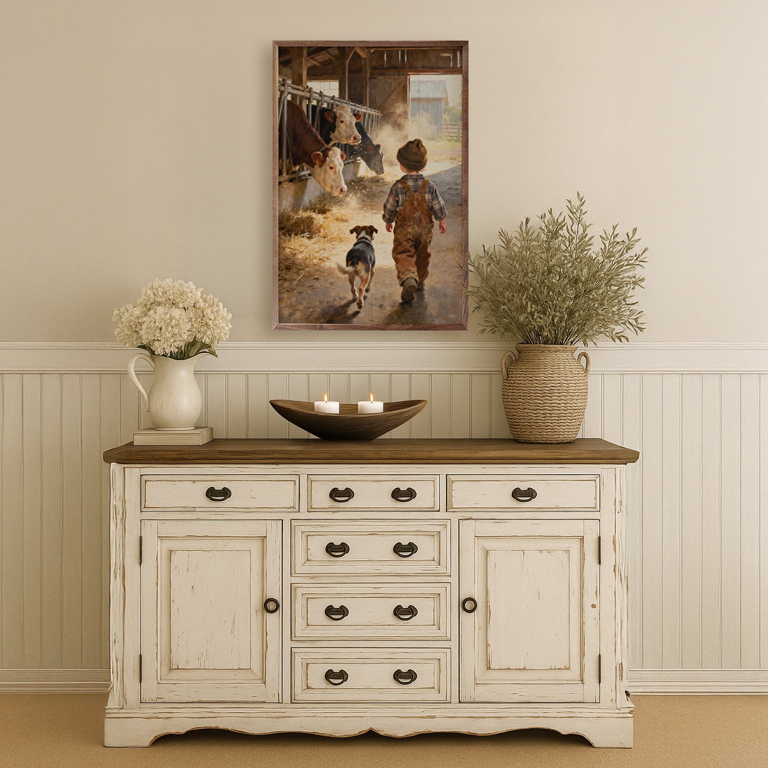 Featuring a solid wood insert with intricate, rustic farm-inspired designs, this piece is framed in rich walnut to showcase the natural wood grain. Its charming craftsmanship and down-to-earth appeal make it a perfect addition to any farmhouse décor, offering timeless style and quality.