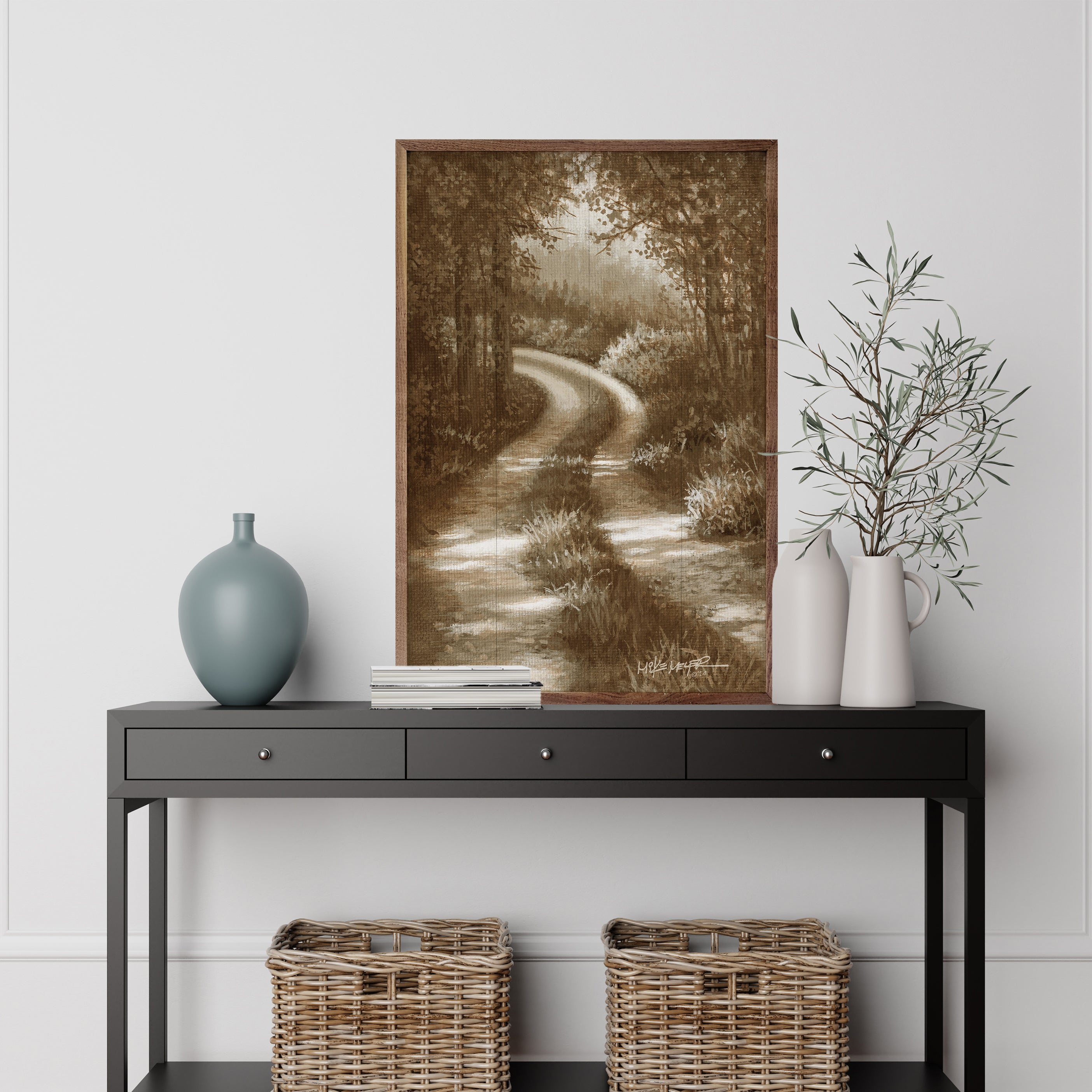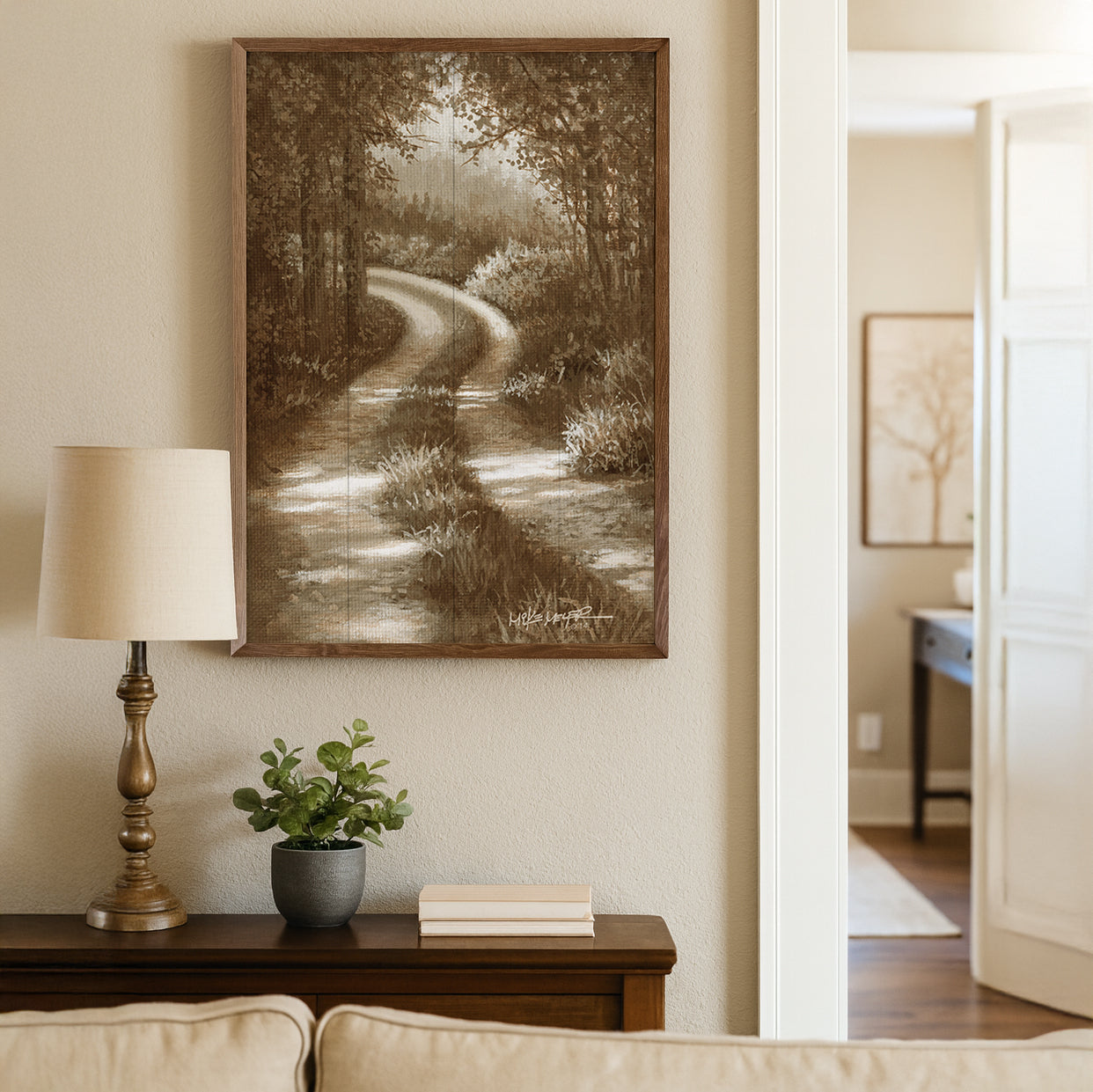 Featuring a solid wood insert with beautiful landscape designs, this piece is framed in rich walnut to highlight the natural wood grain. Its elegant craftsmanship and versatile appeal make it a stunning addition to any décor, offering timeless style and quality.
